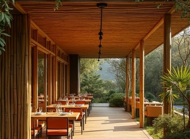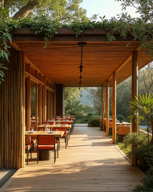 Restaurante com estrutura em bambu, ambiente acolhedor e natural.