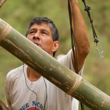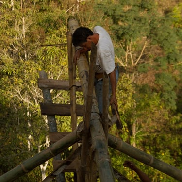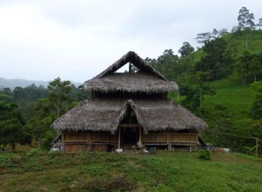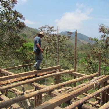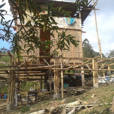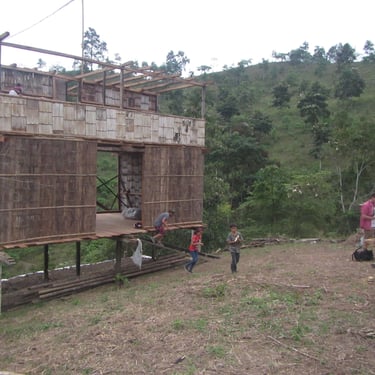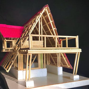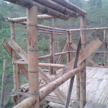Chalé de montanha com estrutura em bambu.